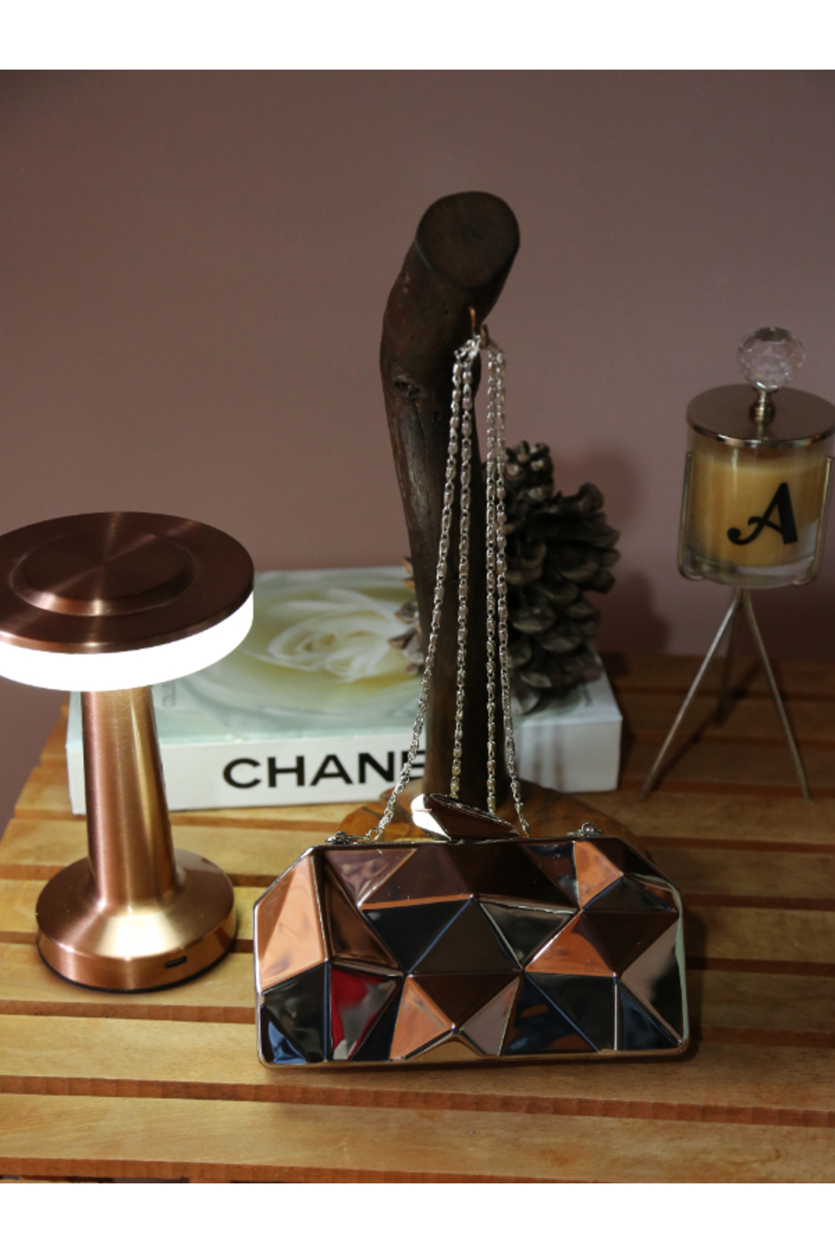 Geometrik Tasarımlı Metalik Gümüş – Gold Kadın Abiye Gece Çantası – Zincir Askılı
