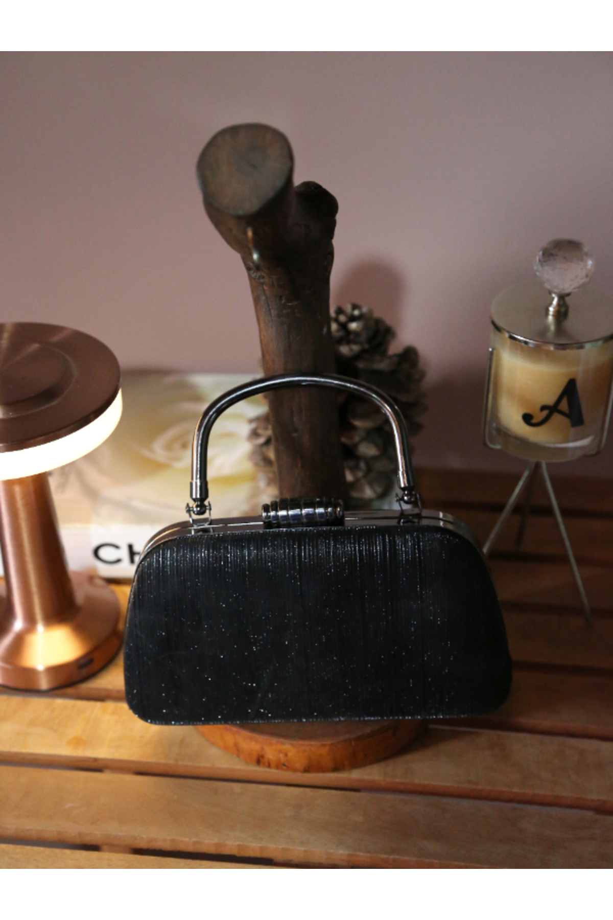 Siyah Simli Dokulu Metal Saplı Kadın Abiye Gece Çantası